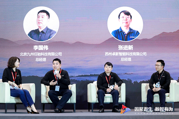 峰會現場,華為中國政企分銷區域銷售部部長王娜、華為中國政企Marketing高級營銷經理姚本俊和北京九州任馳科技有限公司總經理李國偉、蘇州卓越智能科技有限公司總經理張進新一起進行了專題討論,分享伙伴和華為坤靈攜手一年的歷程與收獲。