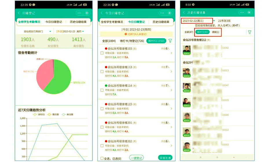 智能考勤機識別學生出入記錄,記錄考勤信息,檢查學生是否按時歸寢,及時獲取晚歸學生信息,避免代刷卡造成的管理漏洞,并將學生考勤情況通過微信發(fā)給家長,實現(xiàn)學校、家庭信息同步。